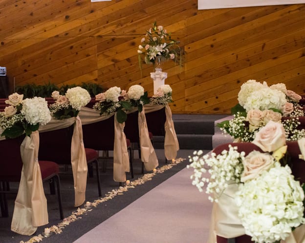 We made ocular visits to the Biblical Community church and we met their pastor and church mates. As for the church design, I made two large floral centerpieces for the altar (something happened to 1 centerpiece, more on that later) and we decorated each aisle with ivory sash, loose petals, and flameless candles. We accentuated the chairs with Hydrangea, Ecuadorian roses, and Baby's breath.